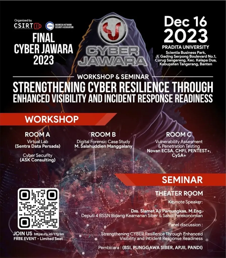 Cyber Jawara isn’t just any competition; it’s a battleground for the brightest minds in cybersecurity in Indonesia. Organized by the giants of cyber defense, CSIRT and IDNSA, it’s where theory meets practice, and skills are put to the ultimate test. And guess what? We were right there, not just watching from the sidelines, but getting our hands dirty.